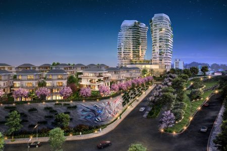 tháp tựa đầu vào nhau và 26 căn biệt thự nghỉ dưỡng hạng sang như đôi chim Phượng Hoàng cùng nhau ấp ủ những quả trứng giữa rừng hoa đào lộng lẫy, hòa vào thiên nhiên vùng đất Di sản.